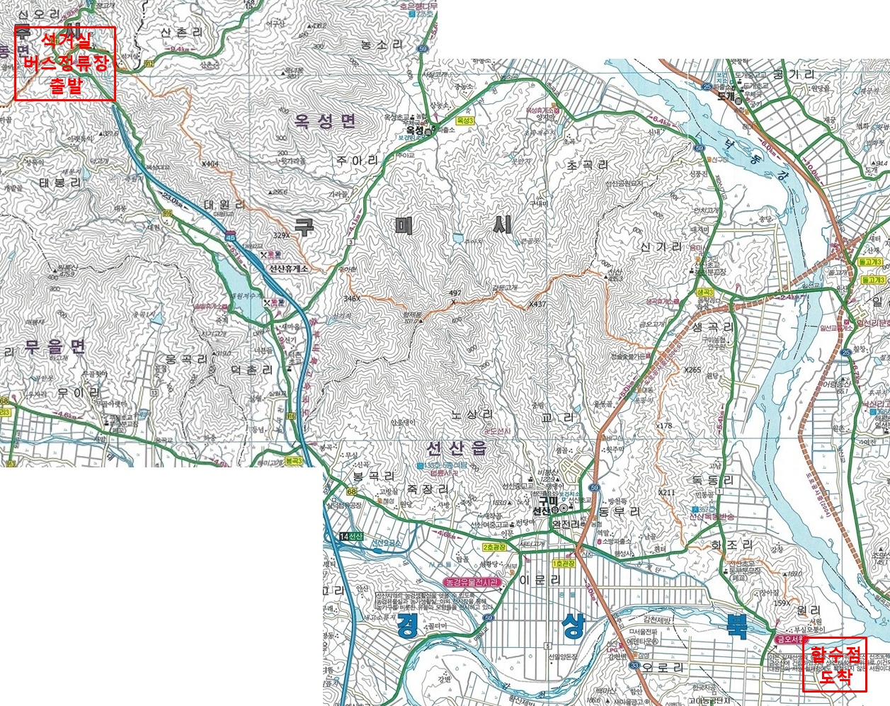 ↑ 물 건너서가 금오지맥 합수점이다.
