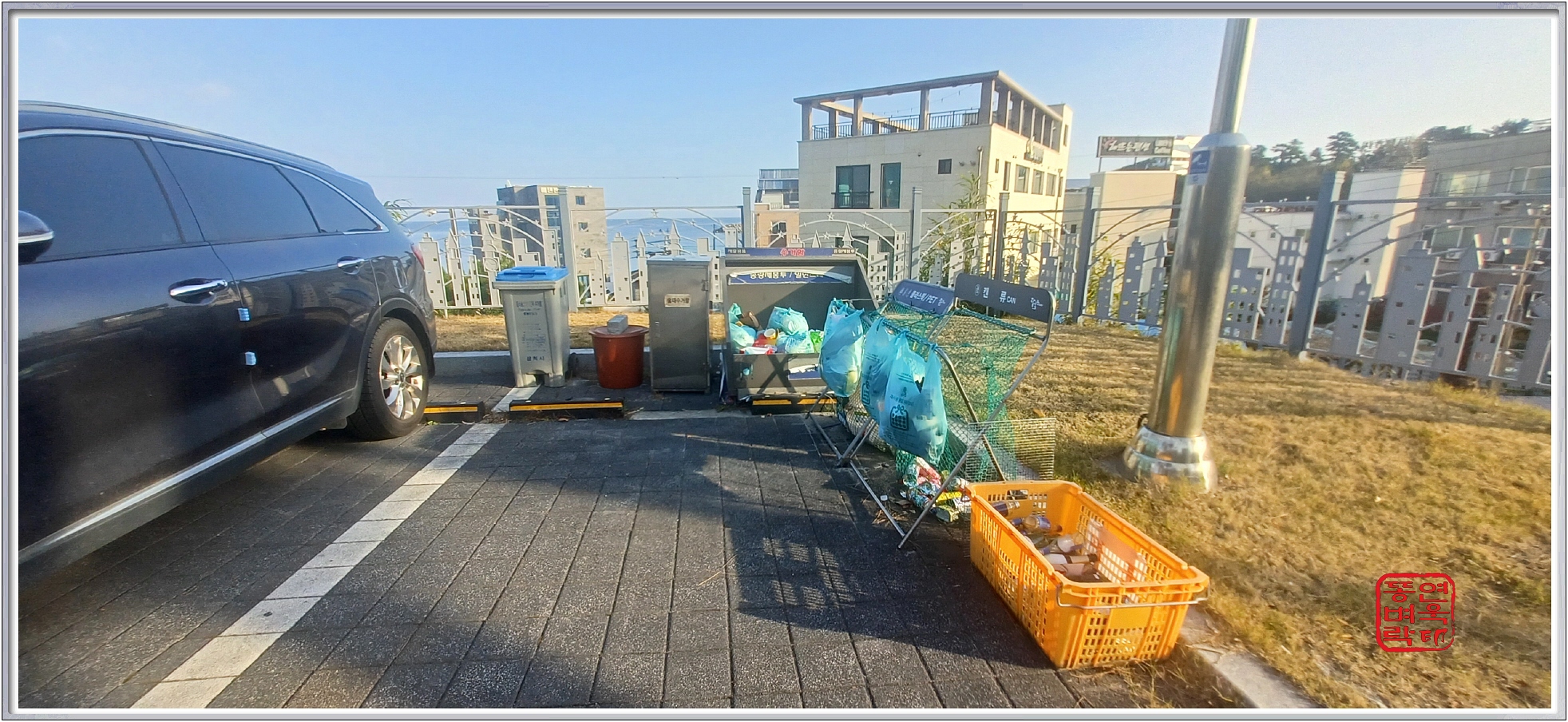 ↑ 차 앞에 올려 두라는 주차증. 종량제봉투와 음식물쓰레기 봉투는 무료로 준다.