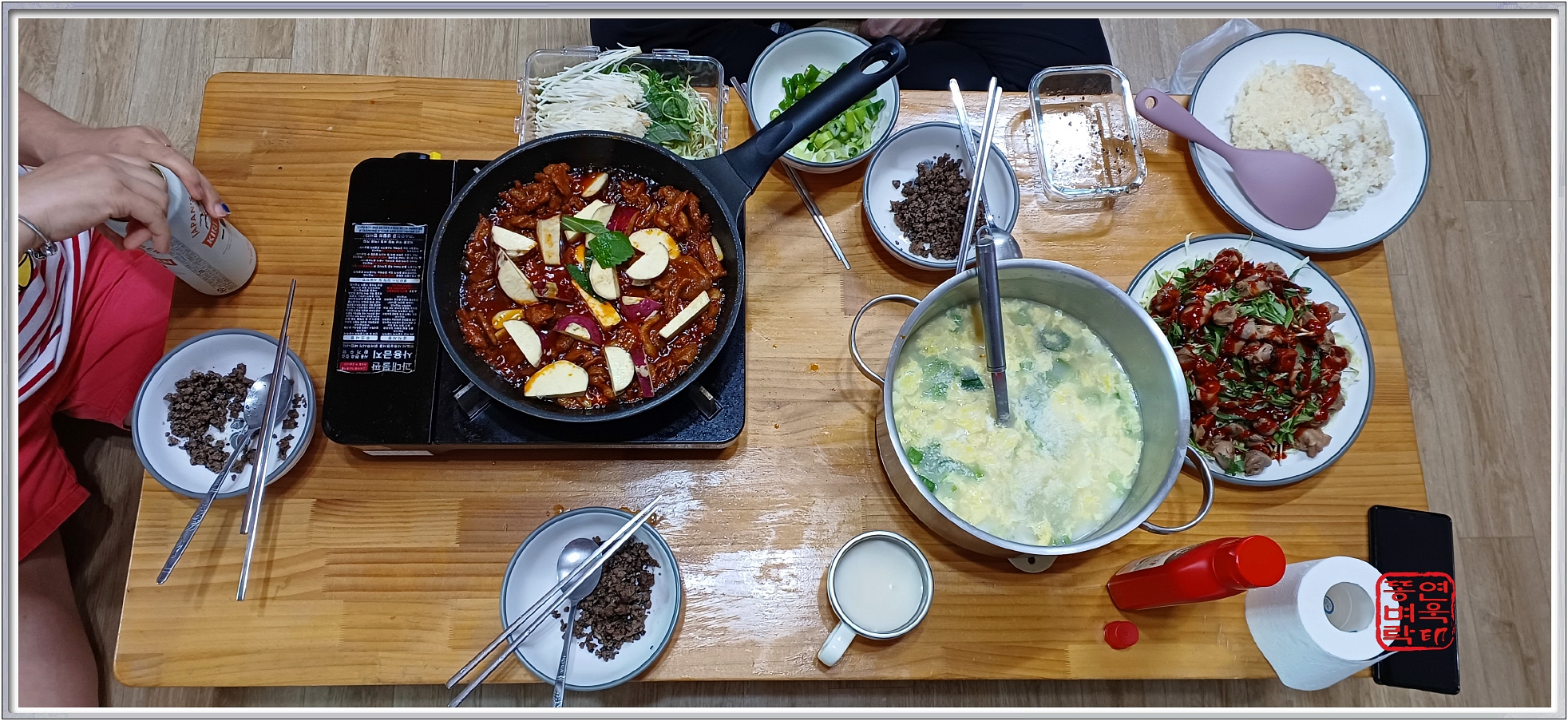 ↑ 오리주물럭과 떡국을 먹으며 오늘을 마무리한다.