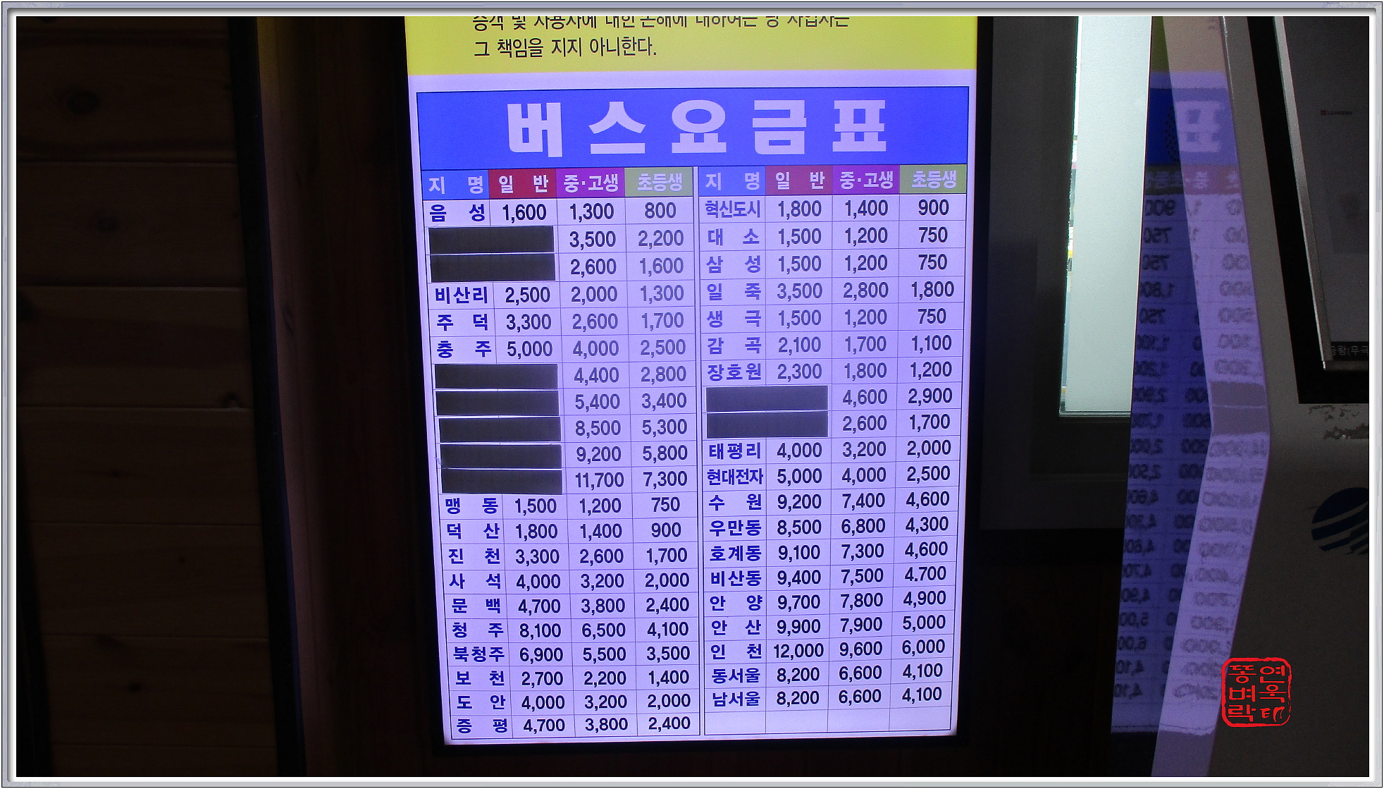 음성 금왕터미널 시간표 및 요금표 (22년 8월 18일 현재)